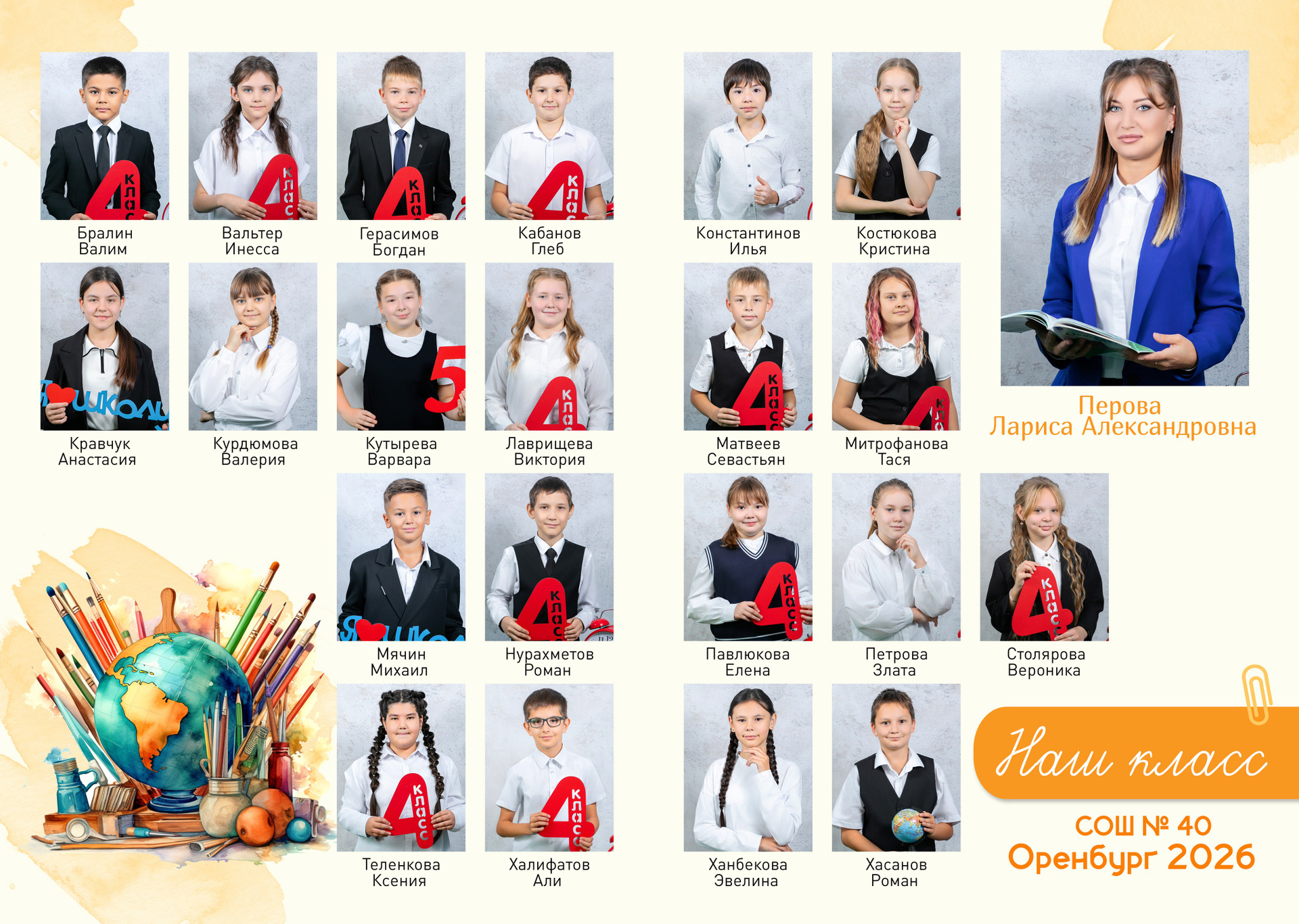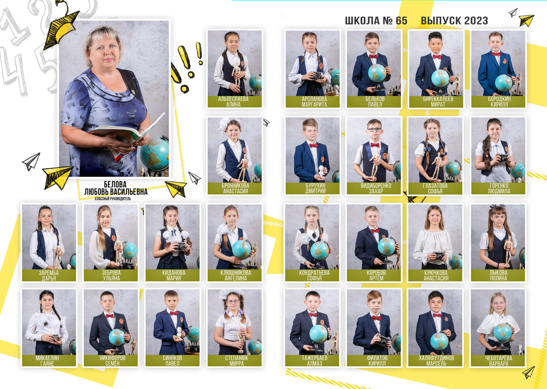 1 разворот — Один портрет Выпускника, фото с учителем и одноклассниками;